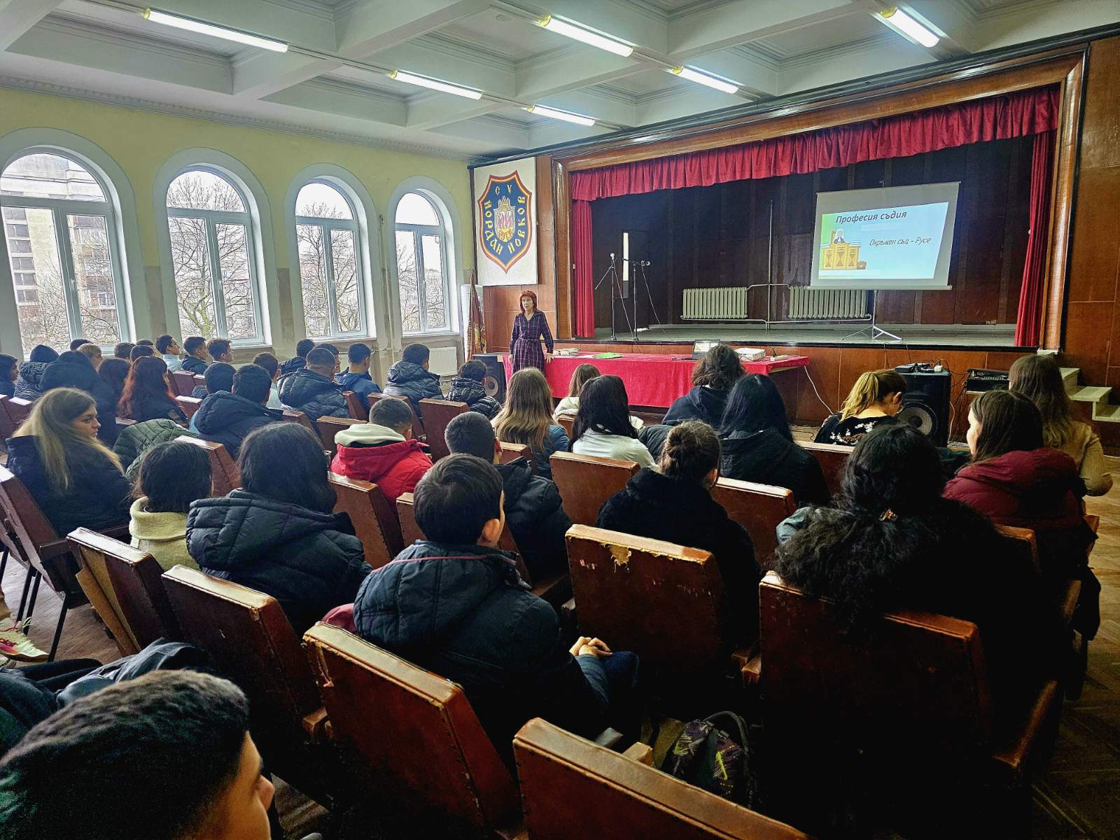 Темата на лекцията за подрастващите учениците от IX и X клас беше "Професиите в Съдебната система". Лектор на събитието беше съдия Антоанета Атанасова, която въведе младежите в основите на правосъдието.